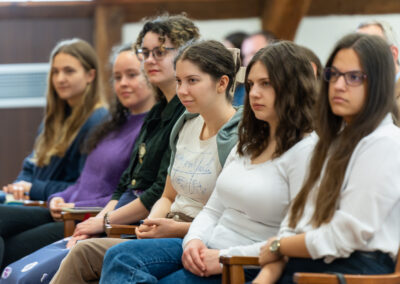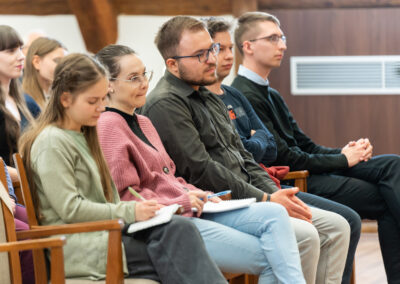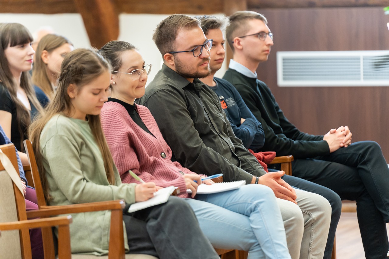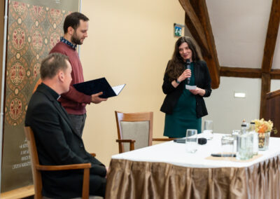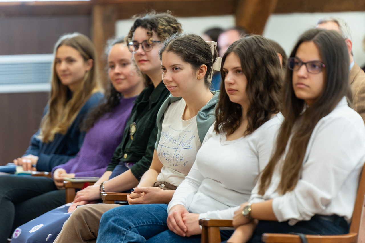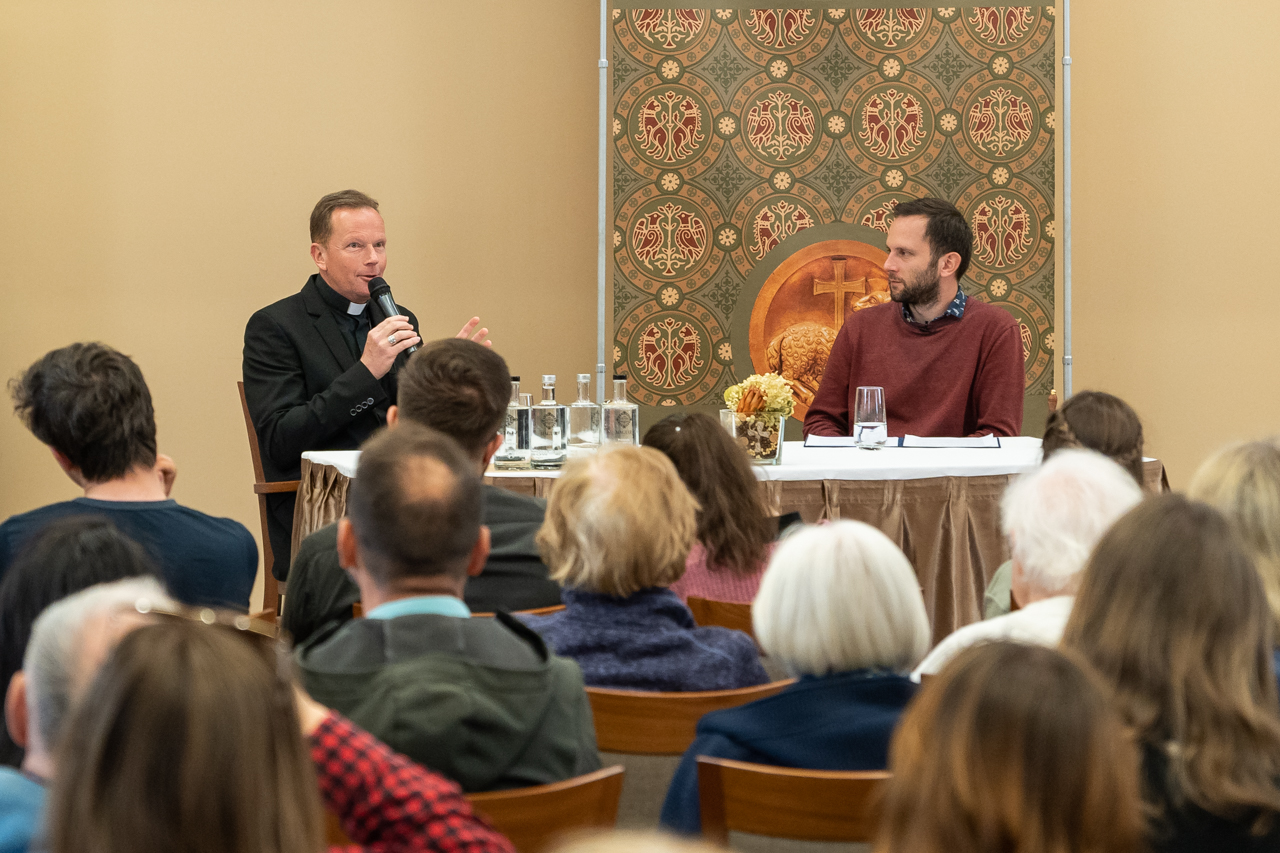 A beszélgetés elején a személyes életút felől közelítettünk. Kornél atya megosztotta velünk, hogyan formálták őt a Gödöllőn vagy a bölcsészkaron eltöltött hónapok és évek. Hogyan formálódott már ekkor a hivatása, milyen élményei kapcsolódnak a Biblia olvasásához, de még a traktorvezetés rejtelmeibe is betekintést kaphattunk. Kornél atya a tőle megszokott közvetlen stílusban mesélt arról is, hogy az Emmánuel közösségben vagy a Szentlélek szemináriumban miként tapasztalta meg az Ige élő valóságát. Elárult nekünk egy-két kulisszatitkot a “Biblia egy év alatt” podcast készüléséről, és a Biblia értelmezéséről felmerülő kérdések kapcsán némi humorral azt is megvitattuk, hogy vajon a jó és a rossz tudás fája, illetve a beszélő kígyók hogyan boldogulhattak az evolúció és a természetes szelekció folyamatában. Kornél atya kiválóan szemléltette azt is, miként érdemes látnunk a Szentírásban megfogalmazódó hittartalom fejlődését – hogyan szorulnak egyre jobban háttérbe a sugalmazott írók emberi véleményei és akár tévedései, és hogyan kerül egyre jobban előtérbe a Jézus Krisztusban beteljesedő isteni Ige, aki felől visszatekintve nyer értelmet az egész Írás. Végül Kornél atya a szakkollégisták által feltett kérdésekre is válaszolt.