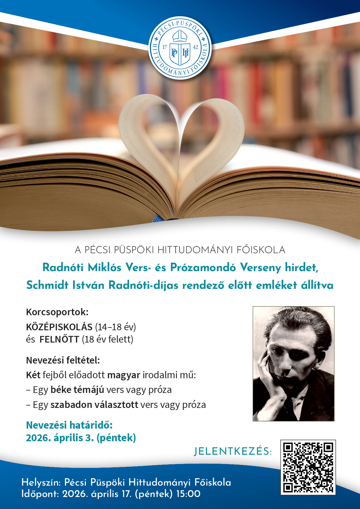 A Pécsi Püspöki Hittudományi Főiskola 2026-ban ismét megrendezi a Radnóti Miklós Vers- és Prózamondó Versenyt, amelynek célja, hogy teret adjon a magyar irodalom értékeinek, valamint lehetőséget biztosítson a fiatalok és felnőttek számára, hogy megszólaltassák azokat a gondolatokat és érzéseket, amelyek a költészeten és prózán keresztül a legmélyebben fejezhetők ki.
